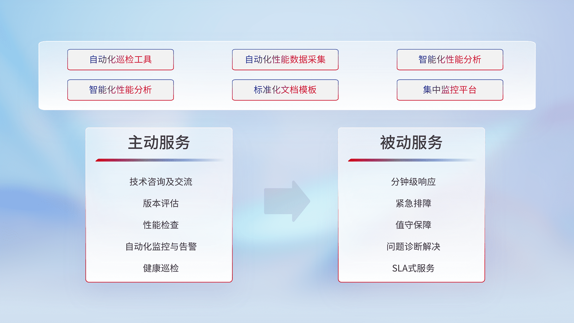 智能化工具和标准化文档,,,保障服务质量,,提供主动服务(包含技术咨询、、版本评估、、、性能检查、、自动化监控与告警、、、健康巡检)和被动服务包含(分钟级响应、、、紧急排障、、、值守保障、、问题诊断解决、、SLA服务)。。